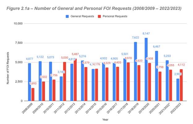 Observing the results from Figure 2.1a (see below), from 2012/2013 to 2017/2018, the number of general and personal requests remained relatively equal, with the total number of FOI requests mirroring a similar trend over the same period. From 2017/2018 up until the November 2021 changes to FOIPPA, there is a marked increase in the number of general information requests relative to personal requests, widening until 2019/2020. This gap remains apparent up until 2021/2022, which is the first year of data collection post-FOIPPA amendments.52 By 2022/2023, the number of personal requests surpassed general requests for the first time since 2013/2014, with the total number of general requests having declined by 44.7% post-FOIPPA changes.