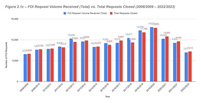 Given that the observations indicate BC is indeed progressing towards its goals according to plan, it is worthwhile to finish off this paper by judging whether this realization is good for the province and British Columbians in general before wrapping everything up. It would not be controversial to contend it is problematic for governments to make it more difficult for its citizens to exercise their right to access information, which in turn, makes them less transparent and accountable. The MCS attempts to address this concern directly in their Fiscal 2023/24 Estimates Briefing, reiterating the argument this reduction in requests (and therefore reduced workload on the FOI system), combined with more proactive disclosures (i.e. information made available to the public without an FOI request) demonstrates their government’s commitment to open and transparent government.79 Although there is no clear common law precedent which has decreed provincial FOI legislation such as FOIPPA ought to be given the same “quasi-constitutional” recognition as the federal Access to Information Act, that should be no reason for the government to actively or incidentally infringe on that fundamental democratic right.