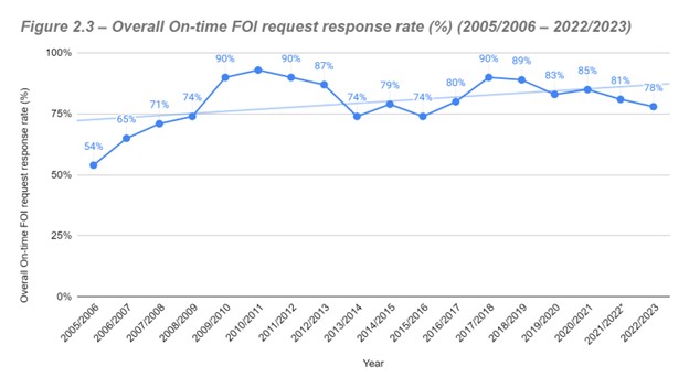 In 2022/2023, there were only 470 cross-government requests, a low which has not been seen since the early 2000s. The province contends that “recent FOI trends have seen applicants directing more targeted requests to specific ministries, rather than submitting broad requests to many ministries.”59 What is subtly hidden within that explanation is the potential admission that applicants are no longer making these broad kinds of requests to all of these different ministries because there’s now a greater price to pay with each and every request. The direct result of the 2021 FOIPPA amendments, it is equally surprising the FOI system’s timeliness has not improved significantly as the result of this decline in cross-government requests.