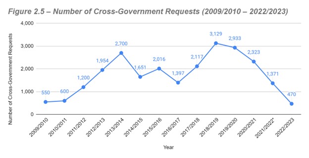 Concluding our analysis of the results from BC in Figure 2.5 (see below), it appears the number of cross-government requests has generally echoed the overall trend of the total number of general requests from 2009/2010 all the way to 2022/2023. These kinds of requests, which take a considerable amount of time and resources to fulfill, have markedly declined since 2019/2020, while attributable in part to the COVID-19 pandemic, it’s not the whole story.